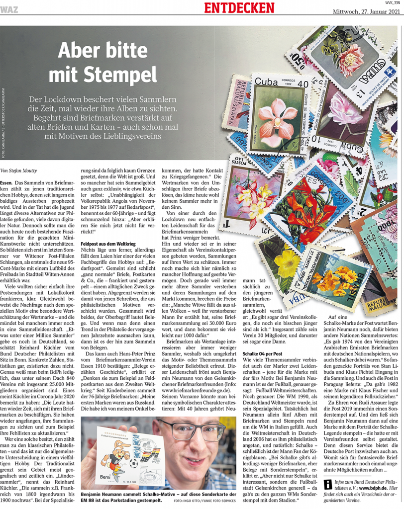 Die Zeitungen der FUNKE Mediengruppe widmeten dem Hobby Briefmarkensammeln unter der Überschrift „Aber bitte mit Stempel“ am 27. Januar 2021 eine komplette Seite in den Ausgaben der WAZ, NRZ, WR, WP und IKZ. Zu Wort in dem Artikel kam auch ein Vertreter der „Gelsenkirchener Briefmarkenfreunde 1967 e.V.“.