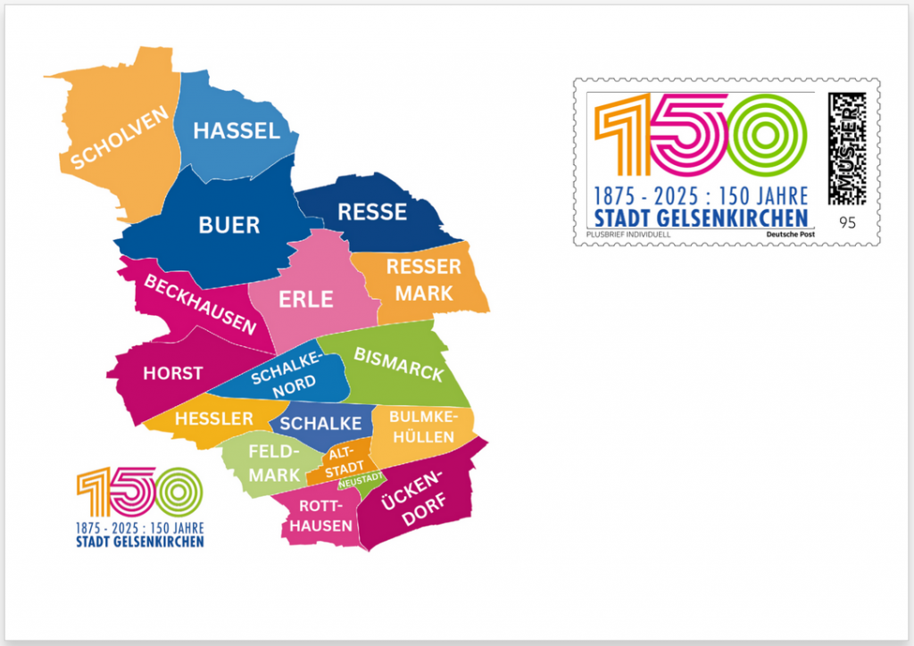 Das Jahr 2025 steht in Gelsenkirchen ganz im Zeichen des Stadtjubiläums. Vor 150 Jahren, am 29. November 1875, erhielt die Gemeinde Gelsenkirchen die Stadtrechte von Kaiser Wilhelm I., König von Preußen, verliehen. Zu diesem Anlass wird es am Großtauschtag am 1. November 2025 einen Sonderstempel sowie einen Plusbrief Individuell geben.