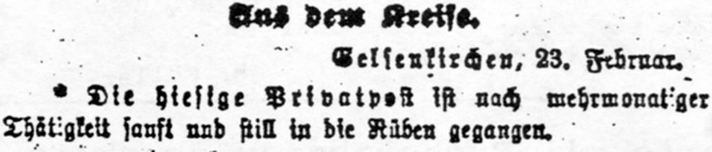 Die letzte Nachricht über die Privat-Brief-Beförderungsanstalt Gelsenkirchen stand am 23. Februar 1898 in der Emscher-Zeitung: