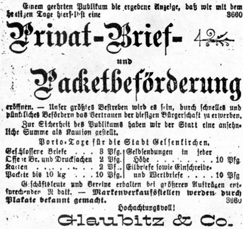 Gelsenkirchen, mit damals 31.582 Einwohnern, bekam am 26. Juli 1897 eine Privat-Postanstalt. Das ist aus alten Akten der Deutschen Reichspost, aber auch aus alten Zeitungen ersichtlich. In einer Gelsenkirchener Zeitung stand folgende Anzeige: