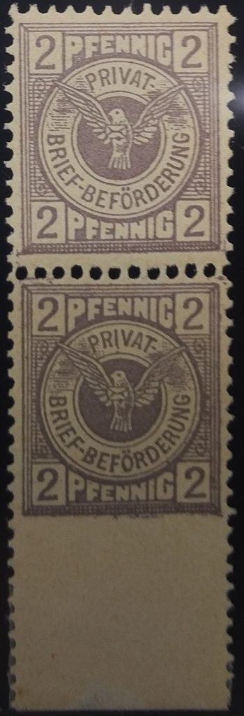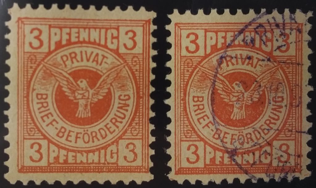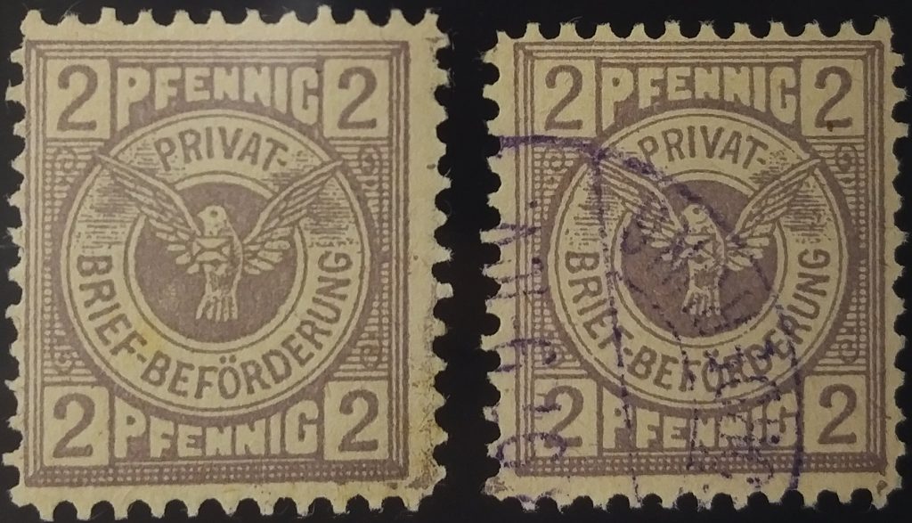 Die Urmarken: 2 Pfg. graulila und 3 Pfg. gelbrot, Marken grob gezähnt