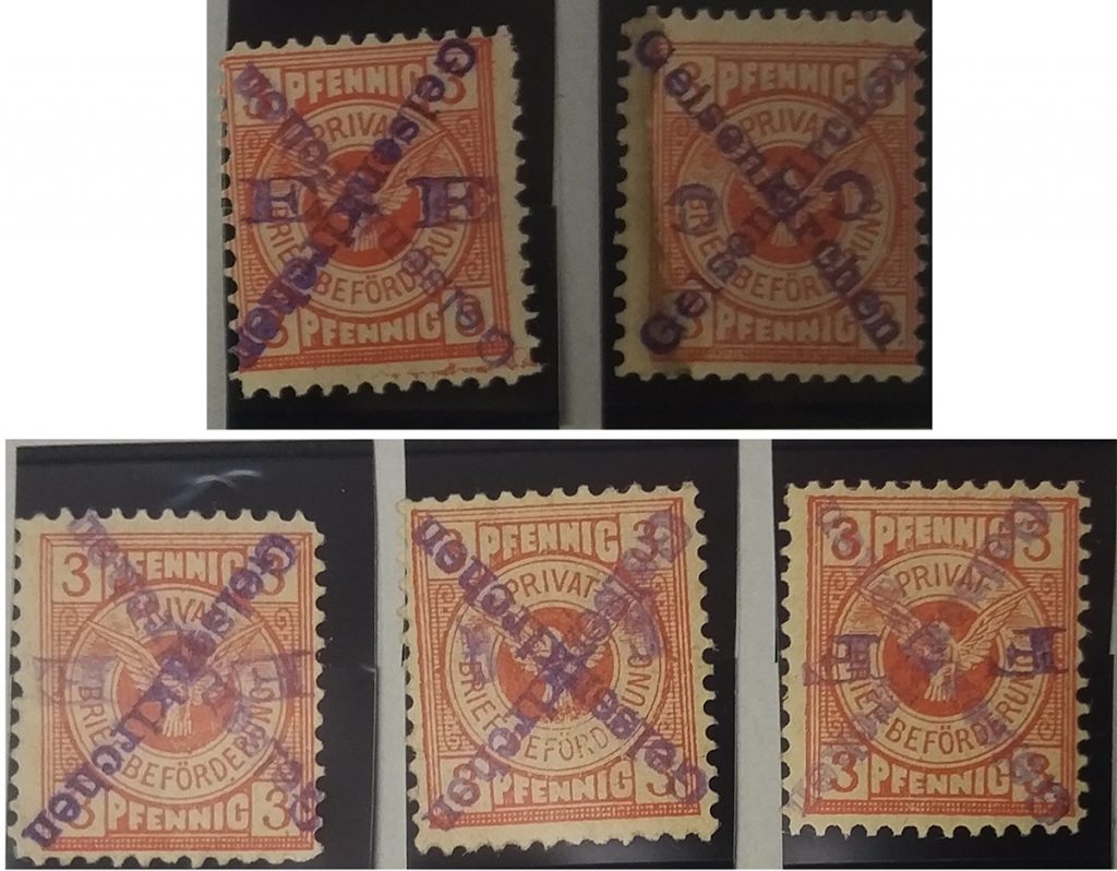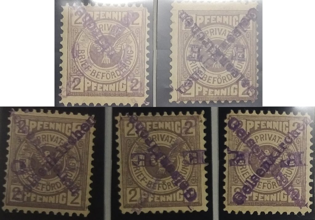 Später wurden alle kreuzweise gestempelten Marken mit einem Kontrollbuchstaben zusätzlich gestempelt: C E F G H. Von der gezähnten 2 Pfg.-Marke graulila wurde ein Bogen (100 Stück) in schwarzem Buchdruck, waagerecht, mit dem Ortsnamen Gelsenkirchen überdruckt. Eine Rarität.